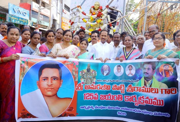 విశాలాంధ్ర,కదిరి..అమరజీవి పొట్టి శ్రీరాములు త్యాగం చిరస్మరణీయమని ఎమ్మెల్యే కందికుంట వెంకట ప్రసాద్ తెలిపారు. సోమవారం స్థానిక టవర్ క్లాక్ వద్దనున్న పొట్టి శ్రీరాములు 125వ జయంతి సందర్బంగా ఆయన విగ్రహానికి పూలమాలలు వేసి నివాళులు అర్పించారు. అనంతరం ఆయన మాట్లాడుతూ రాష్ట్రం కోసం 58 రోజుల దీక్ష చేసి ప్రాణ త్యాగం చేసిన అమరజీవి పొట్టి శ్రీరాములు చరిత్ర భావితరాలకు అందించడం మన బాధ్యత అన్నారు. భవిష్యత్తులో మహనీయుల చరిత్రను దేశమంతా స్మరించుకునేలా పెద్ద ఎత్తున సేవా కార్యక్రమాలు కూటమి ప్రభుత్వం చేస్తుందని తెలిపారు.ఈకార్యక్రమంలో పలువురు టిడిపి కౌన్సిలర్లు, ఆర్యవైశ్య సంఘ నాయకులు పాల్గొన్నారు.
