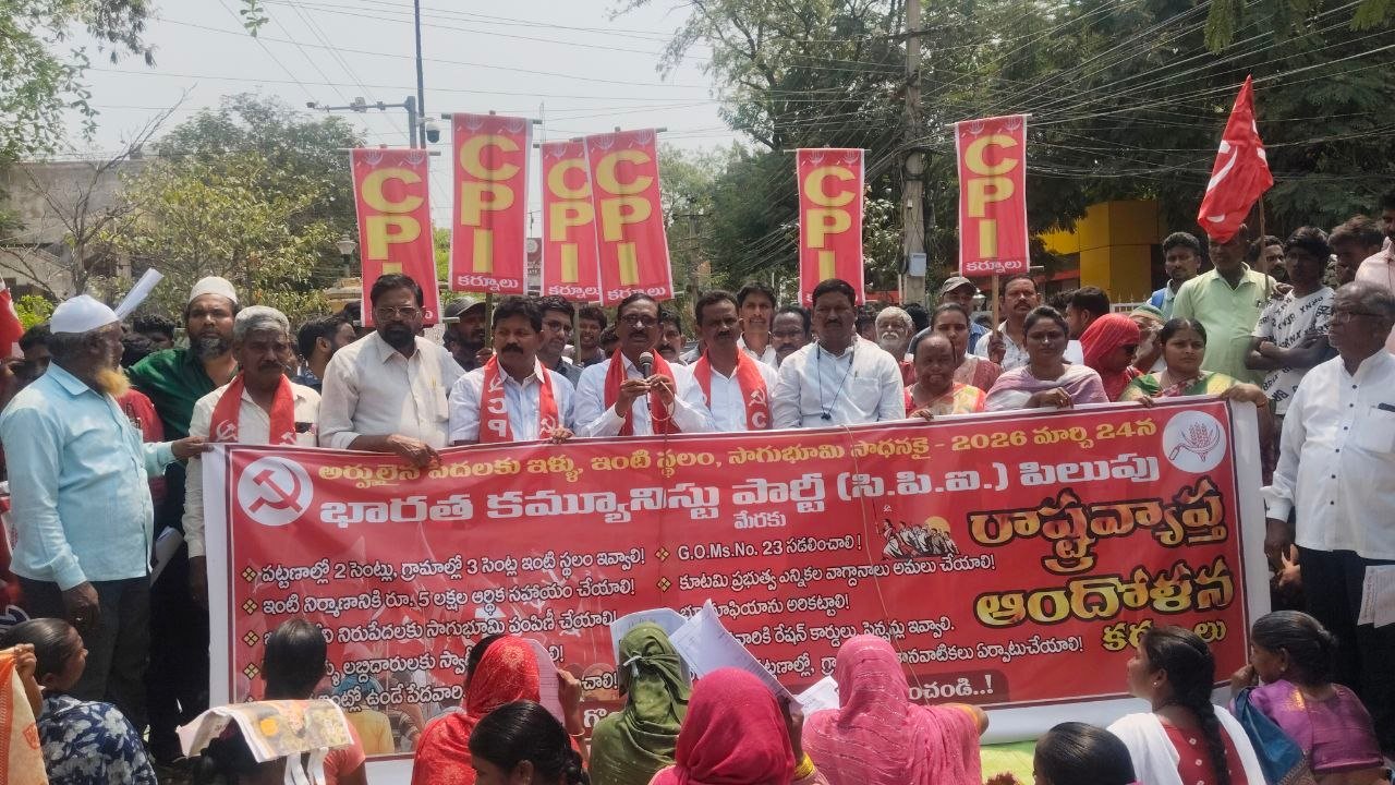 విశాలాంధ్ర బ్యూరో` కర్నూలు : పేద ప్రజలకు ఇంటి జాగా అయినా ఇవ్వండి లేదా అద్దె అయినా చెల్లించాలని లేనిపక్షంలో రాబోయో స్థానిక సంస్థల ఎన్నికలలో కూటమి ప్రభుత్వం పేద ప్రజల ఆగ్రహానికి గురికాక తప్పదని సీపీఐ రాష్ట్ర కార్యదర్శి వర్గ సభ్యులు కె రామాంజనేయులు హెచ్చరించారు. మంగళవారం సీపీఐ రాష్ట్ర సమితి పిలుపు మేరకు కలెక్టరేట్ వద్ద సీపీఐ నగర కార్యదర్శి పీ రామకష్ణారెడ్డి అద్యక్షతన పేదల ఇంటి స్థలాల కోసం ఆందోళన చేపట్టారు. ఈ అందోళన కార్యక్రమాన్ని ఉద్దేశించి రామాంజనేయులు మాట్లాడుతూ గత ఎన్నికల సమయంలో చంద్రబాబునాయుడు తాను అధికారంలోకి వస్తే రాష్ట్రంలోని గ్రామీణ ప్రాంతాల్లో నివాసం ఉండే నిరుపేదలకు మూడు సెంట్లు, పట్టణాల్లో నివాసం ఉండే వారికి రెండుసెంట్ల స్థలం ఇస్తానని హామీ ఇచ్చారని అధికారం వచ్చి 21 మాసాలు అయినా నేటికి దాని ఊసే లేదన్నారు. ఇప్పటికే సీపీఐ ఆద్వర్యంలో పేదలకు నివాసస్థలం ఇవ్వాలని పలుమార్లు ఆందోళన చేసిన ప్రభుత్వం కానీ అధికారులు కానీ ఏమాత్రం పట్టించుకోవడం లేదన్నారు.రాష్ట్ర రెవిన్యూశాఖ మంత్రిని కలసి పేదలు ఆక్రమణలో ఉన్న ఇంటిస్థలాýకు పట్టాలని ఇవ్వాలని కోరడం జరిగిందన్నారు. సీఎం చంద్రబాబునాయుడు దీనిపై ఏమాత్రం మాట్లాడం లేదన్నారు. ప్రదాని మోడీకి అనుకూలమైన వారికి పెద్దఎత్తున విలువైన భూములు దారాదత్తం చేస్తున్నారని, పేదలకు ఇంటిస్థలం ఇవ్వడానికి పట్టించుకోని ప్రభుత్వం కార్పొరేట్కు ఊడిగం చేస్తున్నారని ఆగ్రహం వ్యక్తం చేశారు. చెగువీరా వారసులం అనిచెప్పుకొచ్చిన ఉప ముఖ్యమంత్రి పవన్కళ్యాణ్ దీనిపై ఏమాత్రం మాట్లాడటం లేదన్నారు. కూటమి ప్రభుత్వం ఎన్నికలలో ఇచ్చిన హామీలను అమలు చేయాలన్నారు. టిడ్కో గహాలలో మౌళిక వసతులు కల్పించి లబ్దిదారులకు పంపిణీ చేయాలన్నారు.లేనిపక్షంలో రాబోయో స్థానిక సంస్థల ఎన్నికల్లో ఆయనకు తగిన గుణపాఠం చెపుతారని హెచ్చరించారు. అనంతరం సీపీఐ రాష్ట్రకార్యవర్గ సభ్యులు ఆవుల శేఖర్ మాట్లాడుతూ ఎన్నికలలో హామీ ఇచ్చిన అధికారంలోకి వచ్చిన తరువాత వాటిని అమలు చేయడంలో కూటమి ప్రభుత్వం విఫలం చెందిందన్నారు. తక్షణమే ప్రభుత్వం నివాస్థలం లేని పేదలకు ఎన్నికలలో ఇచ్చిన హమీ మేరకు పట్టణాల్లో రెండుసెంట్లు, గ్రామీణ ప్రాంతాల్లో మూడు సెంట్లు ఇవ్వాలని ఆయన డిమాండ్ చేశారు.ఈ కార్యక్రమంలో సీనియర్ నాయకులు మనోహర్మాణిక్యం, జిల్లా కార్యవర్గ సభ్యులు కె శ్రీనివాసులు, ఏపీ మహిళా సమాఖ్య జిల్లాకార్యదర్శి శ్రావణి, నగర కార్యదర్శి భారతి, సీపీఐ నగర సహాయ కార్యదర్శులు సీ మహేష్, శ్రీనివాసరావు, కార్యవర్గ సభ్యులు వెంకటేష్, బీసన్న, కుమార్, రామచంద్రుడు , నగర సమితి సభ్యులు, వివిధశాఖల కార్యదర్శులు ప్రజాసంఘాలనాయకులు, పేదలప్రజలు పెద్దఎత్తున పా