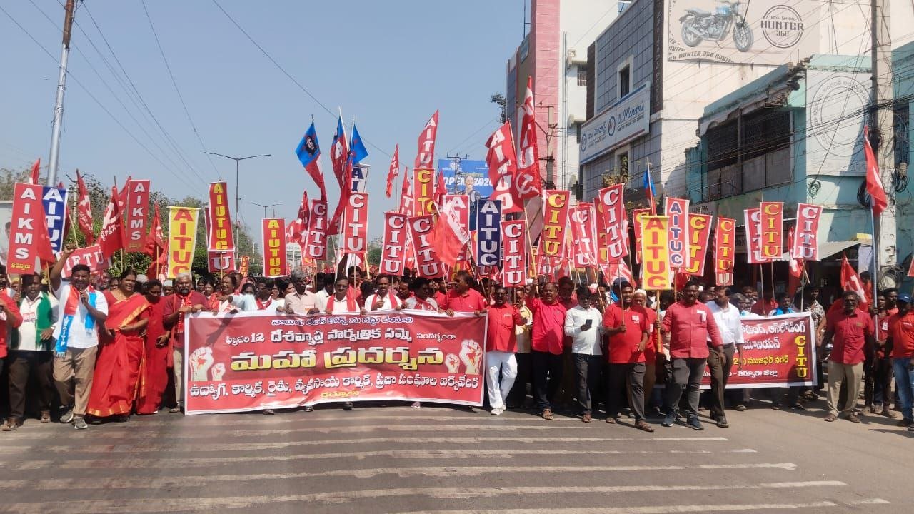 విశాలాంధ్ర బ్యూరో ` కర్నూలు : కేంద్ర ప్రభుత్వం రద్దు చేసిన 44 కార్మికచట్టాలను అమలుచేసి ,నాలుగుకోడ్లను రద్దుచేయాలని ,వీవీజీ రామ్జీ చట్టంను రద్దుచేయాలని,కార్మిక, ఉద్యోగ, ఉపాధ్యాయ వ్యతిరేఖ విధానాల ప్రతిపాధించిన బిల్లులను ఉపసంహరించుకోవాలని డిమాండ్ చేస్తూ కార్మిక సంఘాలు డిమాండ్ చేశారు. గురువారం కేంద్రకార్మిక సంఘాలు పిలుపు మేరకు కర్నూలులో కార్మిక, కర్షక సంఘాలు నగరంలో కదం తొక్కారు.కర్నూలు జిల్లా పరిషత్ నుండి కలెక్టరేట్ వరకు ప్రదర్శన నిర్వహంచి కలెక్టరేట్ వద్ద ధర్నా నిర్వహించారు.ఈ ధర్నా కార్యక్రమానికి ఏఐటీయూసీ నగర కార్యదర్శి జీ చంద్రశేఖర్, సీఐటీయూ నాయకులు నరసింహులు అద్యక్షత వహించారు.ఈ కార్యక్రమంలో ఏఐటీయూసీ, సీఐటీయూ, అనుబంధాల సంఘాలు ,ఏపీరైతుసంఘం, ఏపీ వ్యవసాయకార్మికసంఘాల, ఐఎఫ్టీయూ కార్మికసంఘాల నాయకులు ఈ ప్రదర్శనలో పాల్గొన్నారు. ఈ కార్యక్రమంలో చేతి వతి ్తదారుల సమాఖ్య రాష్ట్ర కార్యదర్శి కె రామాంజనేయులు, ఏపీ వ్యవసాయకార్మికసంఘం రాష్ట్ర ప్రదాన కార్యదర్శి అవుల శేఖర్, ఏపీ రైతుసంఘం రాష్ట్ర కార్యదర్శి కె జగన్నాధం, ఏఐటీయూసీ జిల్లా కార్యదర్శి ఎస్ మునెప్ప, ఏపీ రైతుసంఘం రాష్ట్ర ప్రదాన కార్యదర్శి ప్రభాకర్రెడ్డి, సీఐటీయూ జిల్లా కార్యదర్శి అంజిబాబు , ఐద్వా నాయకురాలు నిర్మలమ్మ , ఏఐటీయూసీ సీనియర్ నాయకులు మనోహర్మాణిక్యం తదితరులు హాజరై మాట్లాడుతూ కేంద్రంలో బీజేపీ ప్రభుత్వం కార్మిక హక్కులను కాలరాస్తుందని విమర్శించారు. స్వాతంత్య్రం వచ్చిన తరువాత కార్మికులు పోరాడి సాధించుకున్న 44 చట్టాలను రద్దుచేసి నాలుగుకోడ్లను అమలు చేయడం దుర్మార్గ మన్నారు. ప్రభుత్వ రంగ సంస్థలనుప్రైవేటీకరణ చేయడం, రైతులు పండించిన పంటకు గిట్టుబాటు ధర కల్పించక పోవడం వలన దేశంలో రైతు ఆత్మహత్యలు పెరిగిపోయాయన్నారు.డిల్లీల రైతుల ఆందోళల సందర్భంగా ఇచ్చిన హామీలను అమలుచేయకుండా రైతులను మోసం చేసిందన్నారు.