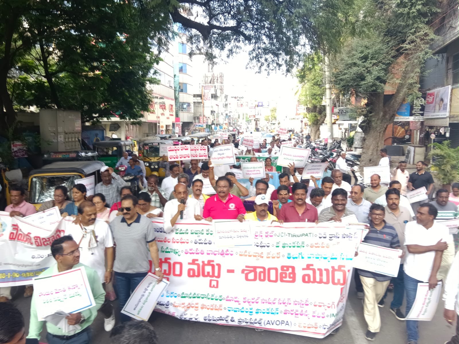 ప్రపంచవ్యాప్తంగా నెలకొన్న ఉద్రిక్త పరిస్థితులు, యుద్ధ వాతావరణం పట్ల ఆందోళన వ్యక్తం చేస్తూ, “యుద్ధం వద్దు – శాంతి ముద్దు”, “యుద్ధం కాదు – శాంతి కావాలి” అనే నినాదాలతో ఈరోజు తిరుపతి నగరంలో విశాలమైన శాంతి ర్యాలీ ఘనంగా నిర్వహించబడింది.మరణిస్తున్న పసి కందులు, అమాయక ప్రజలు మరియు యుద్ధ వాతావరణం పట్ల మనస్సు కలత చెందిన రీచ్ గ్లోబల్ ఫౌండేషన్ చైర్మన్ డాక్టర్ రమేష్ నాథ్ లింగుట్ల, వేమన విజ్ఞాన కేంద్రం ప్రధానకార్యదర్శి మల్లారపు నాగార్జున గారి సంయుక్త పిలుపుతో తిరుపతిలోని దాదాపు 35 సేవా సంస్థలు, ప్రజా సంఘాలు, సాహితీ సంస్థలు, వైద్య రంగ సంస్థలు అన్నీ సంఘటితమై,ఏకతాటిపై నిలిచి ఈ మహత్తర కార్యక్రమాన్ని విజయ వంతంగా నిర్వహించాయి.ఈ శాంతి ర్యాలీ ఉదయం 8:00 గంటలకు మహతి ఆడిటోరియం వద్ద ఘనంగా ప్రారంభమై, ఎన్టీఆర్ సర్కిల్, కృష్ణాపురం ఠాణా, గాంధీ రోడ్డు, శ్రీదేవి కాంప్లెక్స్ ల మీదుగా సాగి పాత మున్సిపల్ కార్యాలయం వరకు కొనసాగింది. ర్యాలీ సాగిన ప్రతి ప్రాంతంలో ప్రజలు ఆసక్తిగా వీక్షిస్తూ, పాల్గొన్న వారిని అభినందించడం జరిగింది.ఈ కార్యక్రమంలో సుమారు 350 మంది శాంతికాముకులు, సామాజిక కార్యకర్తలు, మహిళలు, గాయకులు, సేవా సంస్థల ప్రతినిధులు ఉత్సాహంగా పాల్గొని శాంతి పట్ల తమ నిబద్ధతను చాటిచెప్పారు. చేతుల్లో ప్లకార్డులు, బ్యానర్లు పట్టుకుని “యుద్ధం వద్దు – శాంతి ముద్దు”, “ప్రకృతి రక్షణే మానవ రక్షణ”, “మానవతా విలువలే మన బలం” వంటి నినాదాలతో నగర ప్రజల్లో చైతన్యం కల్పించారు.ఈ సందర్భంగా డాక్టర్ రమేష్ నాథ్ లింగుట్ల, మల్లారపు నాగార్జున, రెడ్ క్రాస్ డాక్టర్ శ్రీహరి, IMA డాక్టర్ A.R రెడ్డి, రోటరీ క్లబ్ రాజేంద్ర, ఛాంబర్ ఆఫ్ కామర్స్ మోహనకుమార్ రాజు, లయన్స్ క్లబ్ మధుసూదన్ రెడ్డి, రాజచంద్ర దుర్గా ప్రసాద్,పౌర చైతన్య వేదిక వాకా ప్రసాద్,సాకం నాగరాజ,రాఘవ, జన విజ్ఞాన వేదిక రెడ్డెప్ప,నడ్డి నారాయణ, రీచ్ ప్రతినిధి దేవ రాజులు,వే ఫౌండేషన్ అంకయ్య, శ్రీరాములు, గాయకులు కడివేటి, నాగ రాజు తదితర అన్ని సంస్థల ప్రతినిధులు మాట్లాడుతూ, ప్రపంచవ్యాప్తంగా జరుగుతున్న యుద్ధాలు మానవాళికి తీవ్ర నష్టం కలిగిస్తున్నాయని, అమాయక ప్రజలు, చిన్నారులు తీవ్రమైన బాధలను అనుభవిస్తున్నారని ఆవేదన వ్యక్తం చేశారు. శాంతి, సహనం, పరస్పర గౌరవం, మానవతా విలువలు నేటి సమాజానికి అత్యవసరమని పేర్కొన్నారు. తిరుపతి వంటి ఆధ్యాత్మిక క్షేత్రం నుంచి ప్రపంచ దేశాలకు శాంతి పిలుపునివ్వడం ద్వారా సానుకూల మార్పు సాధ్యమవుతుందని వారు విశ్వాసం వ్యక్తం చేశారు.