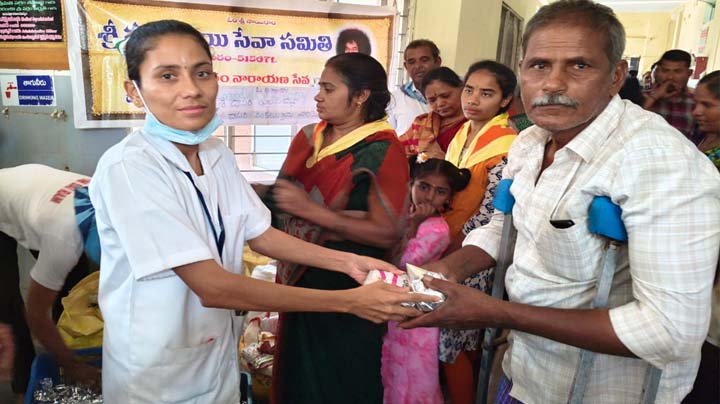 విశాలాంధ్ర ధర్మవరం;; రోగులకు చేసే సేవా దైవ సేవతో సమానమని శ్రీ సత్య సాయి సేవ సమితి -గాంధీనగర్ కన్వీనర్ నామా ప్రసాద్ తెలిపారు. ఈ సందర్భంగా వారు మాట్లాడుతూ పట్టణంలోని ప్రభుత్వ ఆసుపత్రిలో 360 మంది రోగులకు, సహాయకులకు భోజనపు ప్యాకెట్లను, వాటర్ ప్యాకెట్స్ లను, తదుపరి ప్రత్యేకంగా గర్భిణీ స్త్రీలకు స్వీట్ లను వైద్యులు, సిస్టర్ల చేతులు మీదుగా అందజేశారు. ఈ సేవా కార్యక్రమానికి దాతలుగా కీర్తిశేషులు దాసరి తులసమ్మ, వెంకటస్వామి వారు నిర్వహించడం పట్ల వారికి కృతజ్ఞతలను తెలియజేశారు. అనంతరం నామా ప్రసాద్ మాట్లాడుతూ దాతల సహాయ సహకారములతోనే ఈ సేవా కార్యక్రమాన్ని గత కొన్ని సంవత్సరాలుగా పుట్టపర్తి బాబా ఆశీస్సుల ద్వారా చేయడం మాకెంతో సంతోషాన్ని ఇస్తుందని తెలిపారు. తదుపరి ప్రభుత్వ ఆసుపత్రి సూపర్డెంట్ త్రిపేంద్ర నాయక్ మాట్లాడుతూ శ్రీ సత్య సాయి సేవ సమితి వారు చేస్తున్న ఇటువంటి సేవా కార్యక్రమాలు రోగులకు వరంలాగా మారాయని తెలుపుతూ ఆసుపత్రి తరఫున కృతజ్ఞతలను తెలియజేశారు. కార్యక్రమంలో 27 మంది సేవాదళ్ సభ్యులు పాల్గొన్నారు.