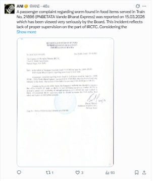రైలు నెం 21896 వందే భారత్ ఎక్స్ప్రెస్ లో అందించిన ఆహార పదార్థాలలో పురుగు కనిపించిందని 15.03.2026న ఒక ప్రయాణికుడు ఫిర్యాదు చేయగా, బోర్డు దానిని చాలా తీవ్రంగా పరిగణించింది. ఈ సంఘటన ఐఆర్సీటీసీ వైపు నుంచి సరైన పర్యవేక్షణ లోపాన్ని ప్రతిబింబిస్తుంది. ఈ లోపాల తీవ్రతను పరిగణనలోకి తీసుకుని సేవలలో ఇటువంటి లోపానికి గాను ఐఆర్సీటీసీపై రూ. 10 లక్షల జరిమానా విధించాలని సమర్థ అధికారి నిర్ణయించారు. అంతేకాకుండా, భవిష్యత్తులో ఇటువంటి సంఘటనలు పునరావృతం కాకుండా నిరోధించేందుకు రైలులోని సేవలను కఠినంగా పర్యవేక్షించాలని ఐఆర్సీటీసీకి రైల్వేశాఖ సూచించింది.